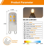 2.5 Watt (equivalent 25 Watt Halogen) 120V T4 JCD Type, Dimmable, G9 Bi-pin Base looped (9 mm between pins), LED light bulbs.